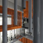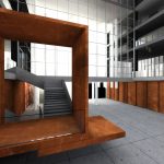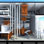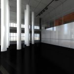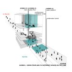 Play with the strength of light makes the visitor start to explore the building. At the end of the dark tunnel (image #2) light penetrates from a glass platform (image #3) and leads to a dramatic atrium flooded with natural light. Light pipes define this space and also provide it with natural light and ventilation (see detail light pipes). The first performing space (image #3) could be the platform itself with the columns playing the role of a backstage in this case. A backstage which can be only reached if the journey through the underwater tunnel (image #2) is processed – tiny and dark space after which you enter a space resembling a cathedral (image #5) – where light penetrates through the light pipes. This is the primary stage and the core of the cube. The main space with views to the secondary stages – the glass floor stage cut from the building and the performance center above it. When reaching the exterior glass floor stage people with their shadows become part of the performance.